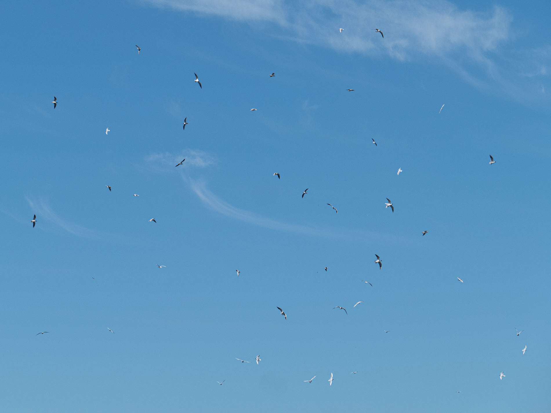 Lachmöwen (Chroicocephalus ridibundus) zahlreich an den größeren (flachen) Gewässern innerhalb der Feuchtwiesen, dort auch Bruten; eine Sturmöwe (Larus canus) überfliegend im Frühsommer22; Trauerseeschwalbe (Chlidonias niger) wenige auf Beuteflug über der Hunte im Frühsommer22