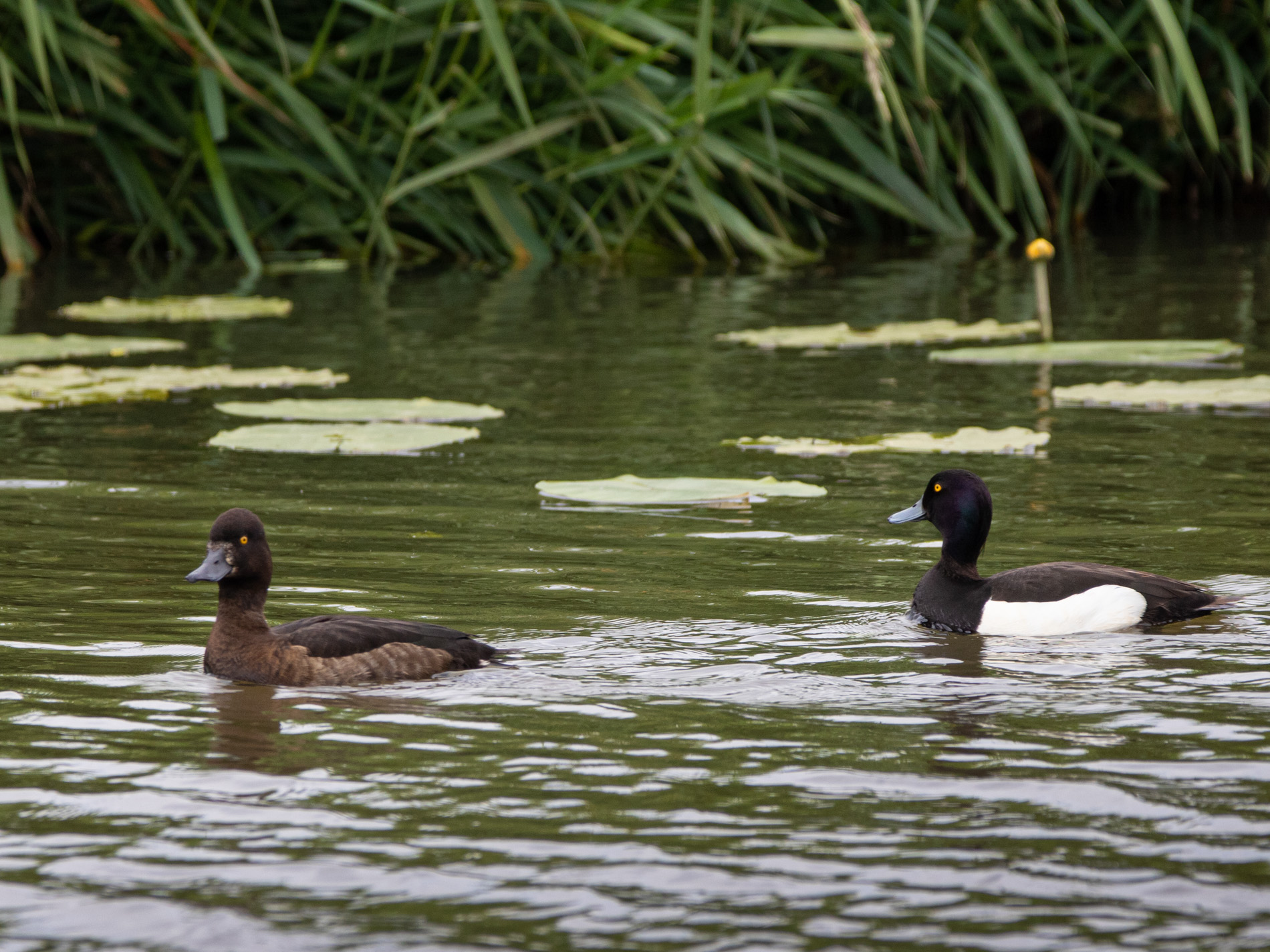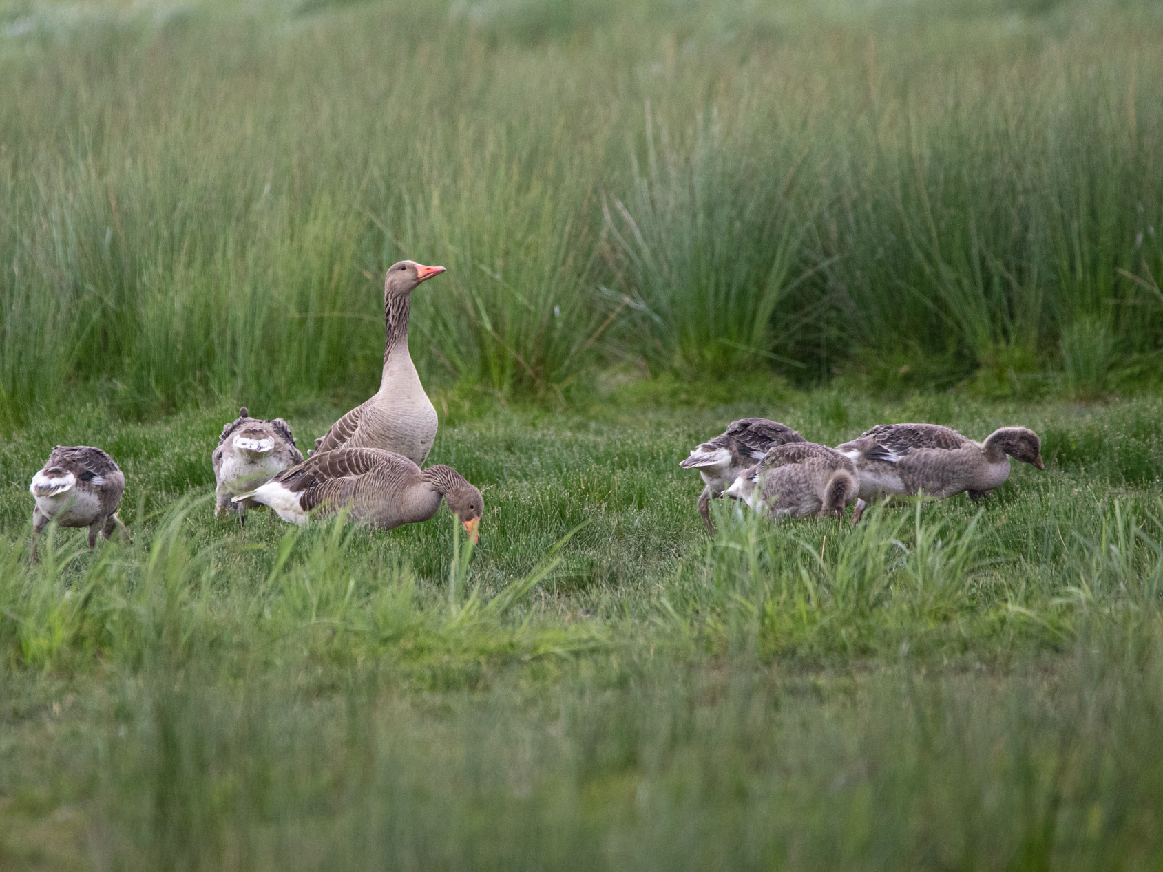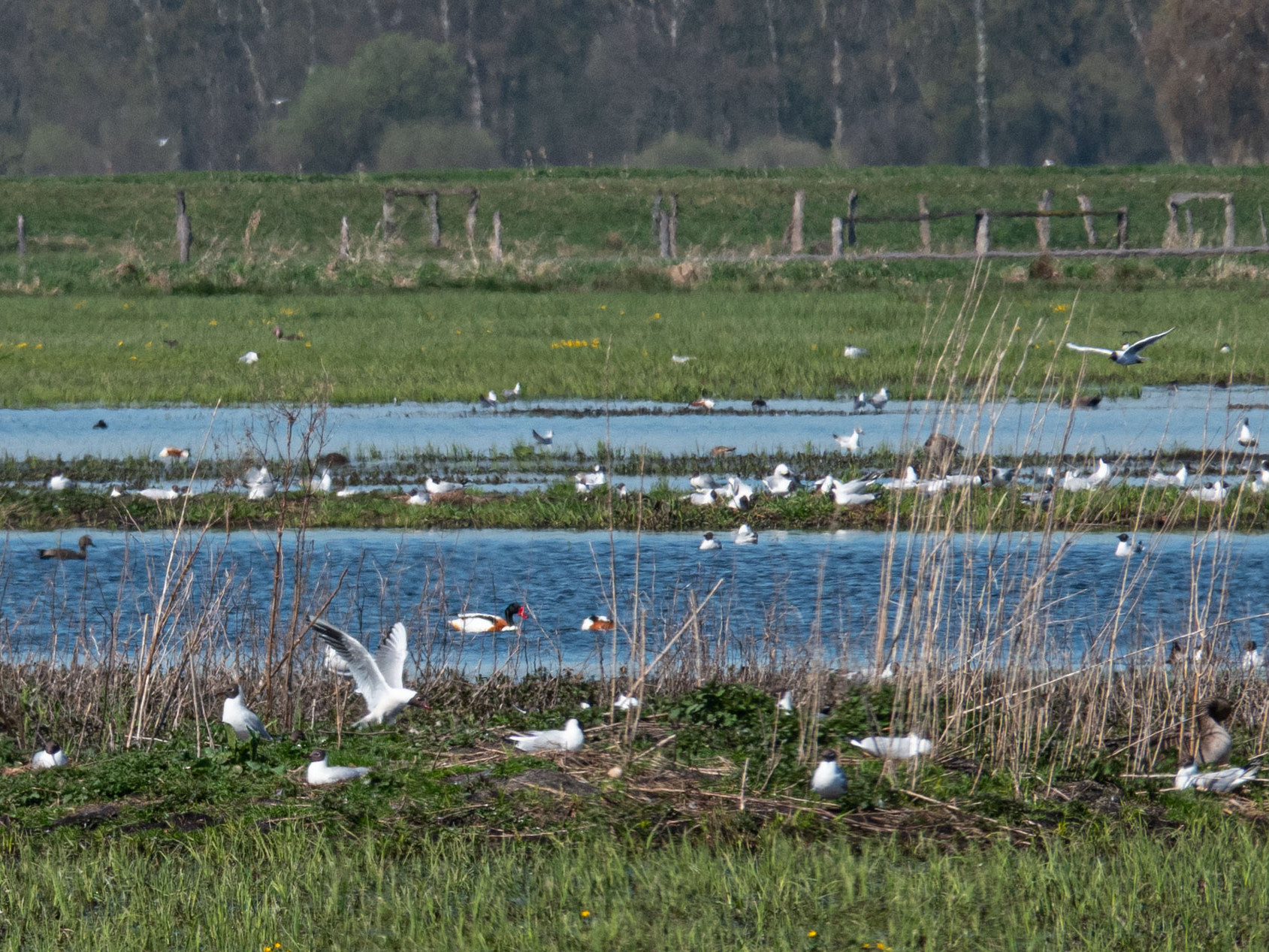 Graugans (Anser Anser) zahlreich auf den feuchten Wiesen; Nilgans (Alopochen aegyptiaca) vereinzelt [Frühsommer22]; Brandgans (Tadorna tadorna) [Frühsommer22], einige auf den etwas tieferen Wasserflächen auf den Feuchtwiesen [April22, Frühsommer22], Reiherente (Aythya fuligula) einige auf der Hunte und größeren Kanälen [Frühsommer22]; Löffelente (Aythya fuligula) einige auf den etwas tieferen Wasserflächen auf den Feuchtwiesen [April22]