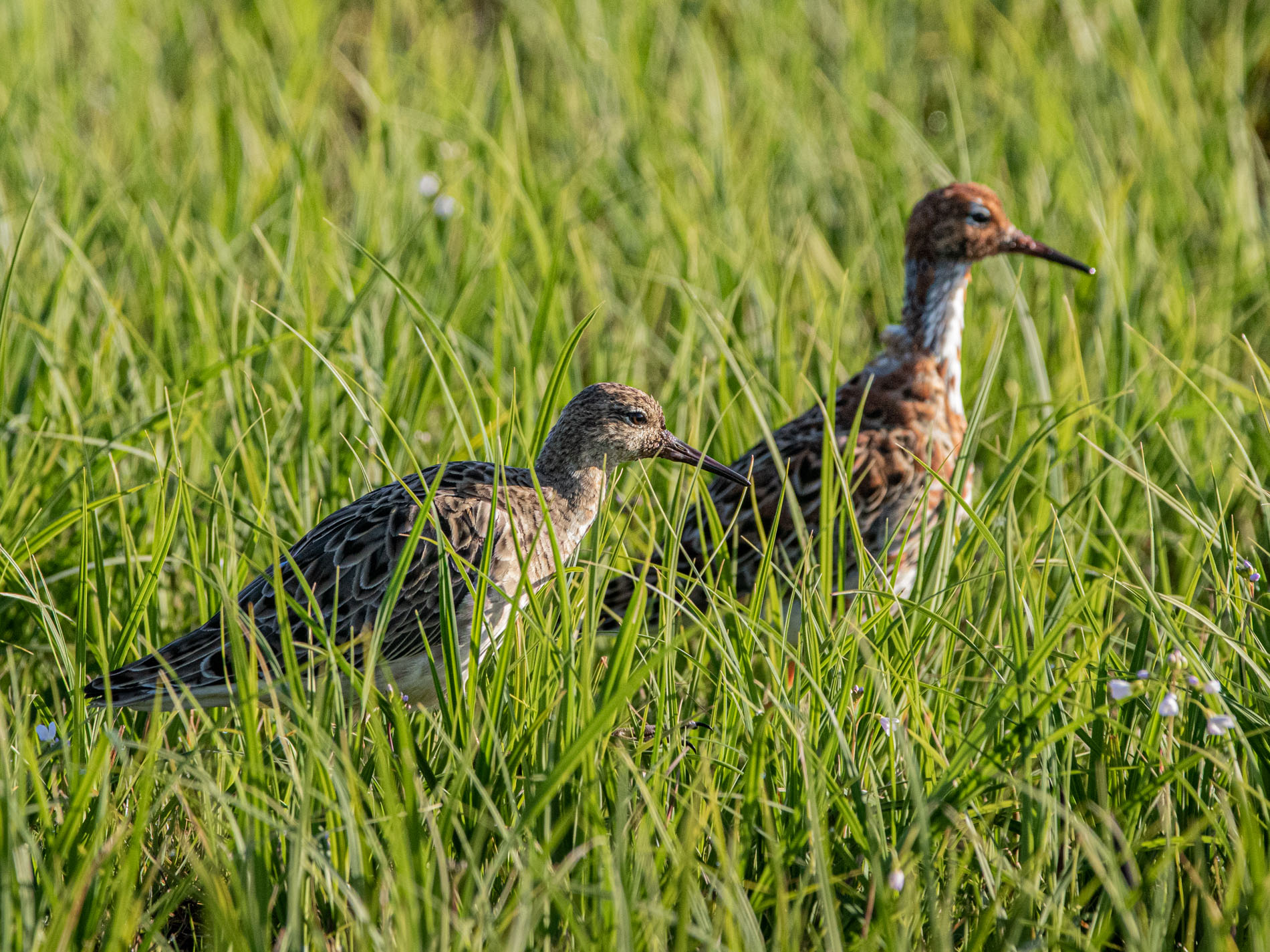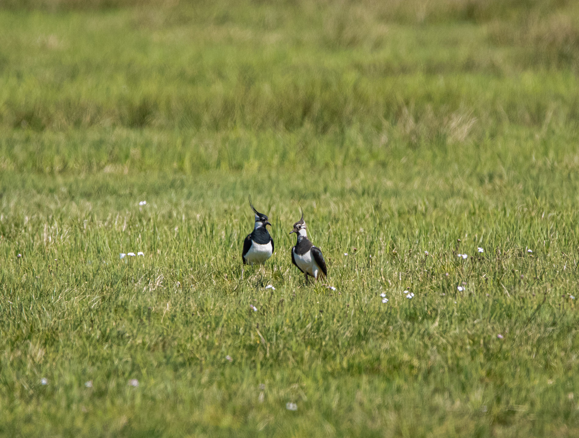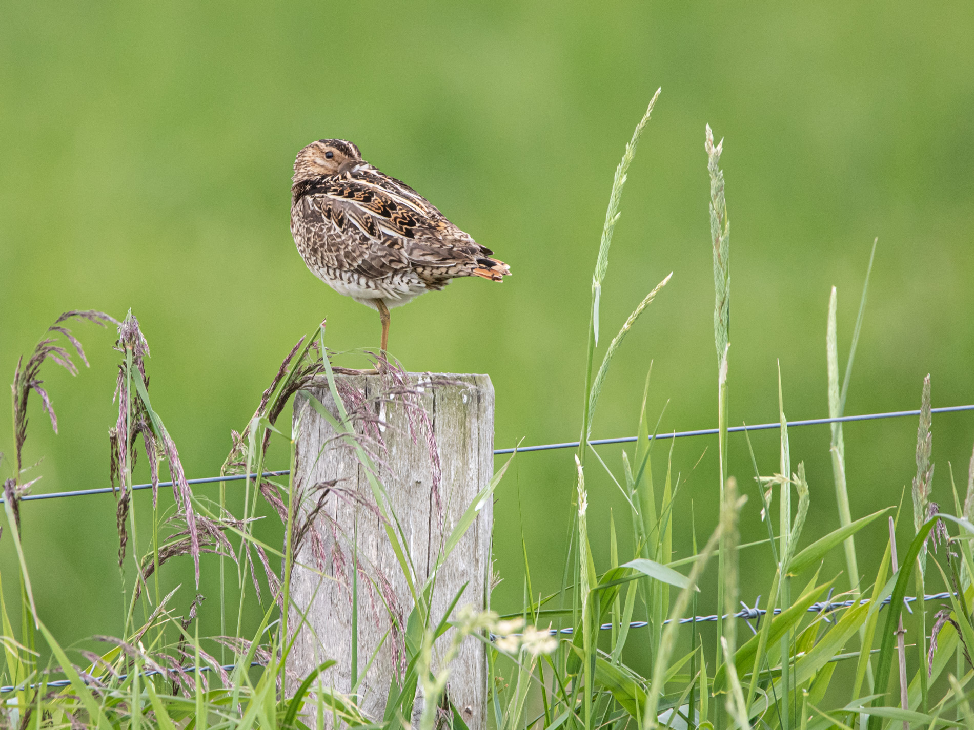 Kiebitz (Vanellus vanellus) zahlreich als Durchzieher im Frühjahr und Herbst, aber auch Brutvogel; Großer Brachvogel (Numenius arquata) überfliegend [April22]; Uferschnepfe (Limosa limosa) sehr zahlreich in den Wiesen [April22], oft auf den Zaunpfählen, im Frühsommer22 Jungvögel; Kampfläufer (Calidris pugnax) Durchzieher, im April22 viele Männchen im schon ins Prachtkleid mausernd, keine Weibchen gesichtet;  Bekassine (Gallinago gallinago) keine Beobachtung im April22, aber vermutlich schon anwesend, im Frühsommer22 oft auf Zaunpfosten, Rotschenkel (Tringa totanus) häufig im April22 und Frühsommer22, oft auf Zaunpfosten