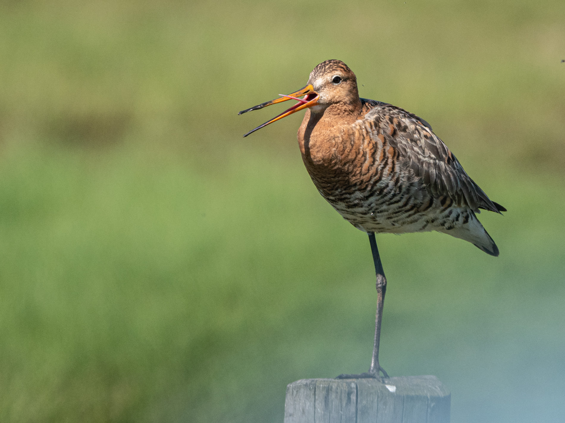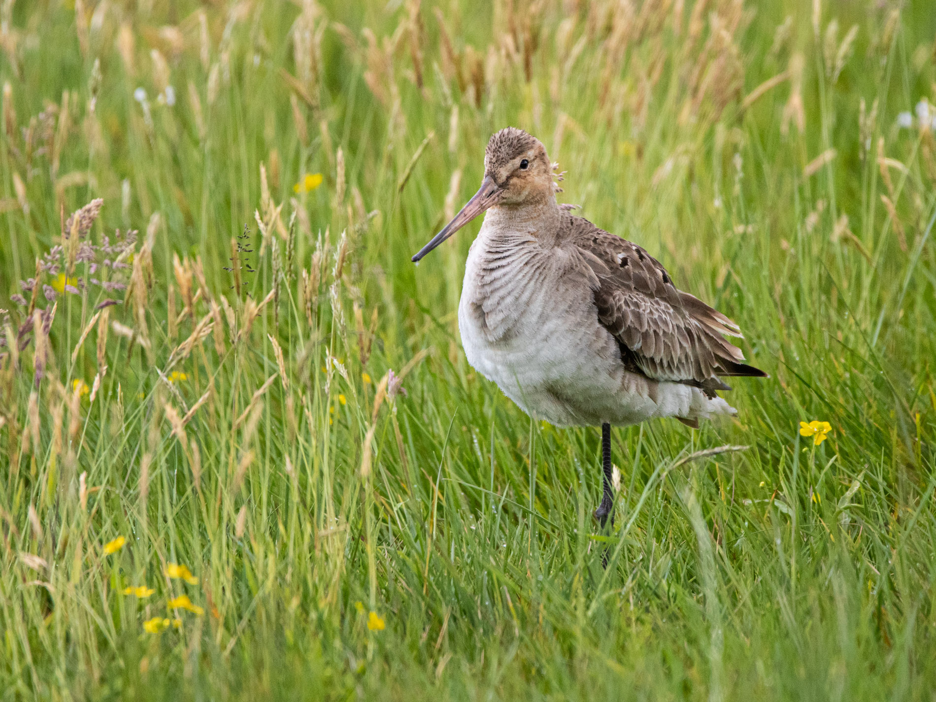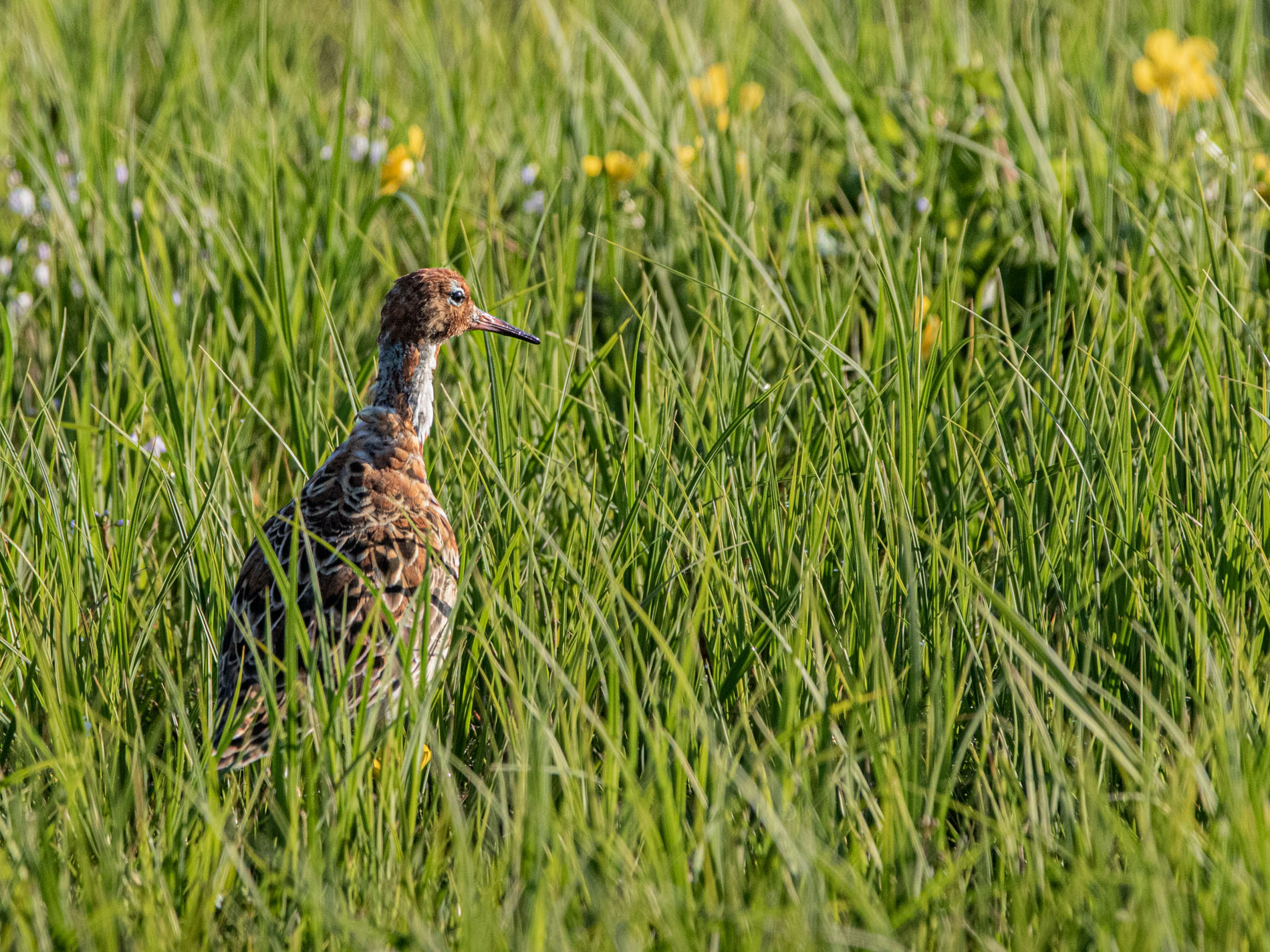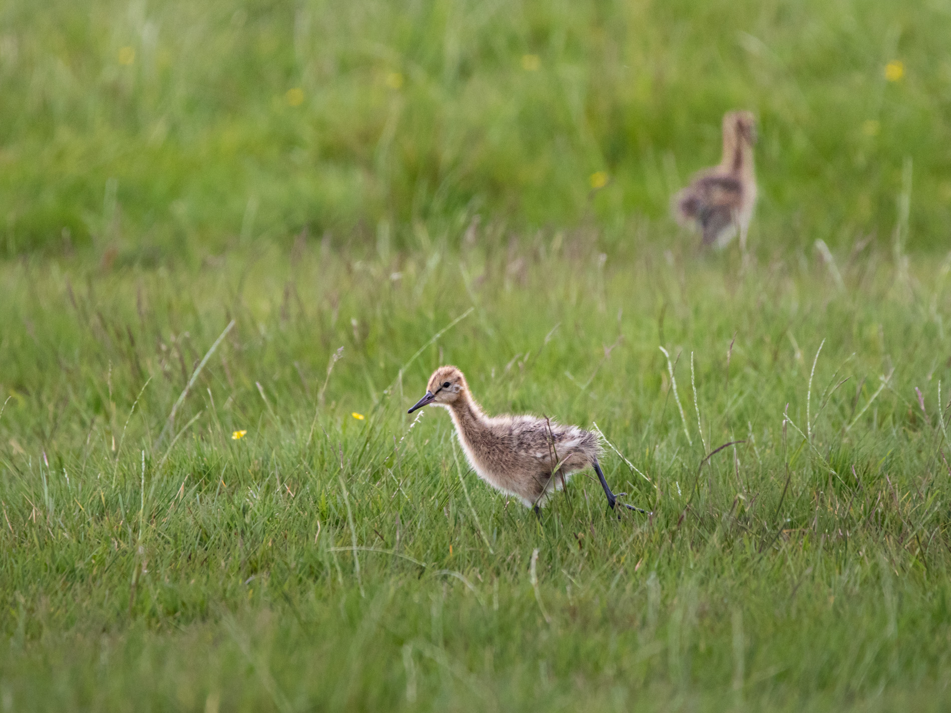 Kiebitz (Vanellus vanellus) zahlreich als Durchzieher im Frühjahr und Herbst, aber auch Brutvogel; Großer Brachvogel (Numenius arquata) überfliegend [April22]; Uferschnepfe (Limosa limosa) sehr zahlreich in den Wiesen [April22], oft auf den Zaunpfählen, im Frühsommer22 Jungvögel; Kampfläufer (Calidris pugnax) Durchzieher, im April22 viele Männchen im schon ins Prachtkleid mausernd, keine Weibchen gesichtet;  Bekassine (Gallinago gallinago) keine Beobachtung im April22, aber vermutlich schon anwesend, im Frühsommer22 oft auf Zaunpfosten, Rotschenkel (Tringa totanus) häufig im April22 und Frühsommer22, oft auf Zaunpfosten