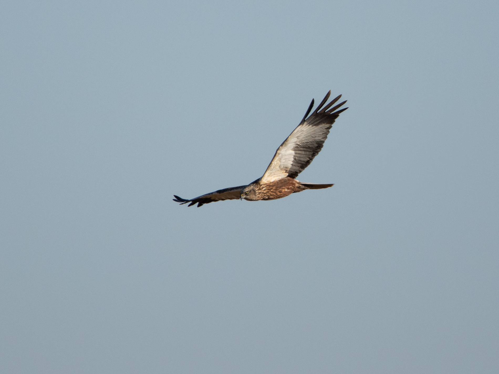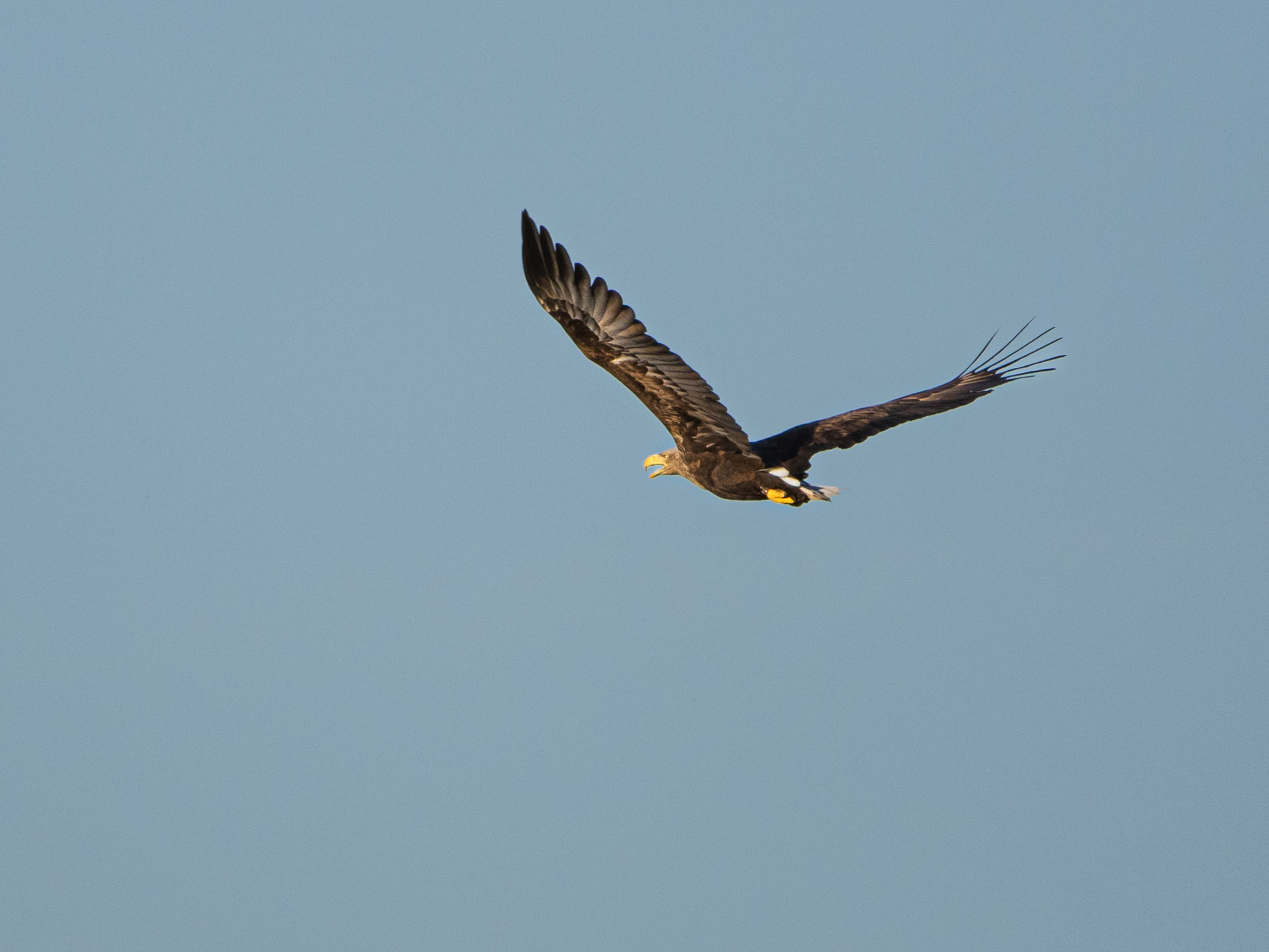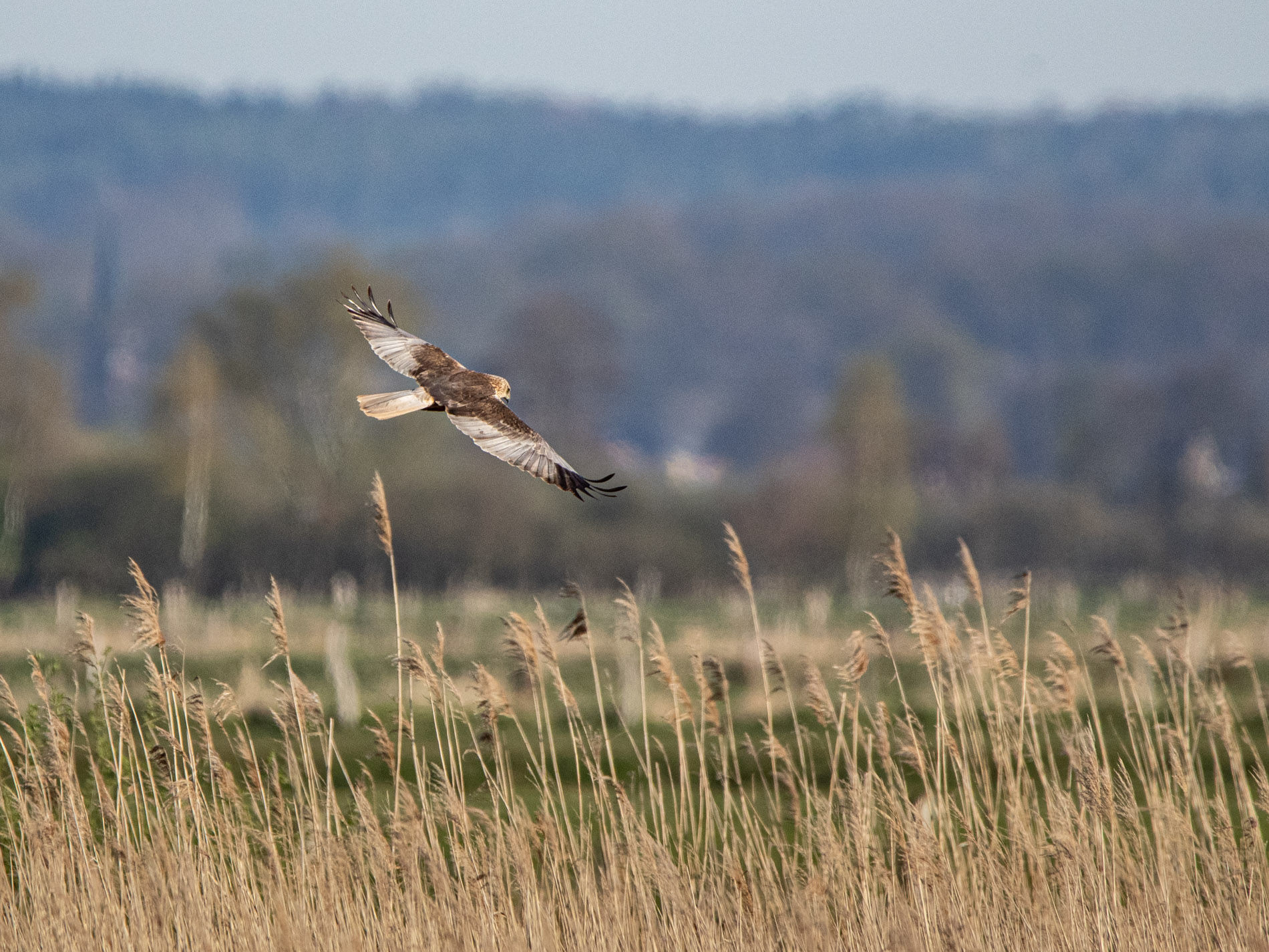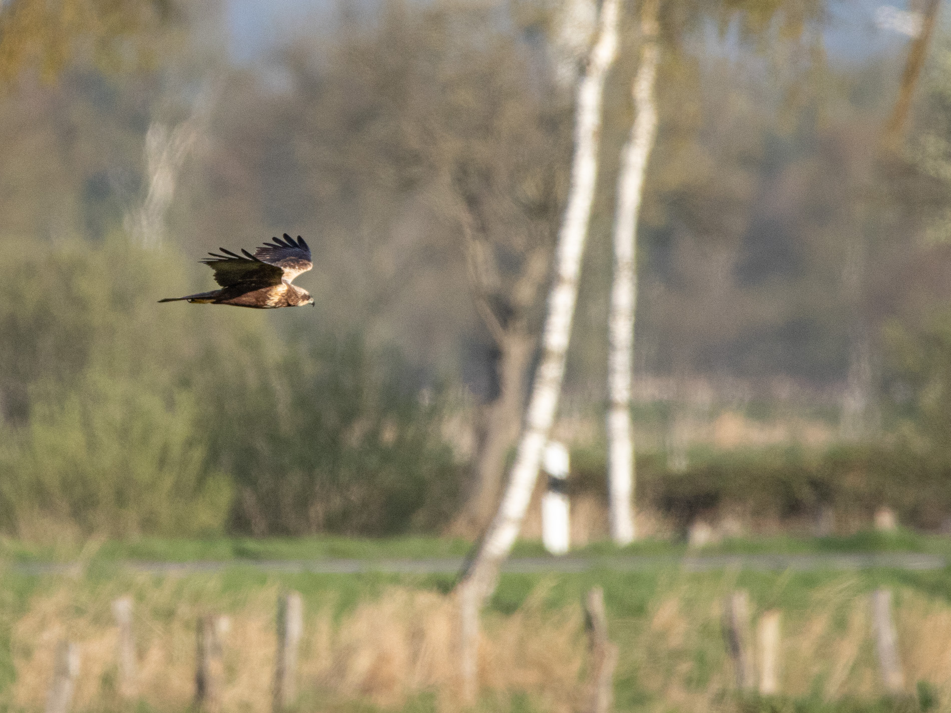 Rohrweihe (), männl. + weibl., fliegend über dem Röhricht an der Hunte (Versuchtsschilfpolderanlage) unweit des Schäferhofs; Seeadler (Haliaeetus albicilla) oft überfliegend