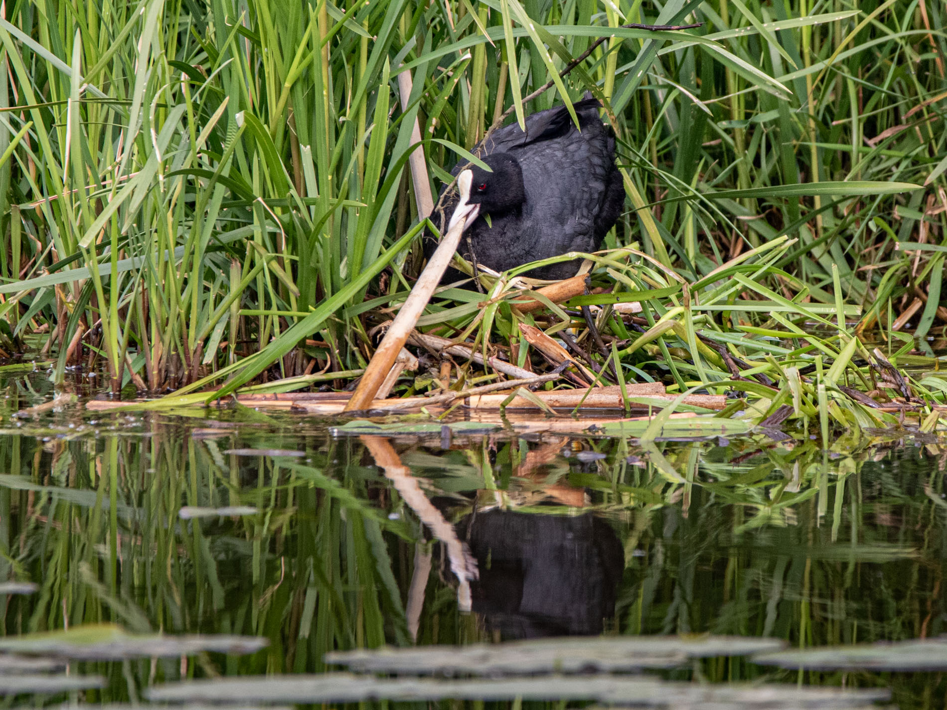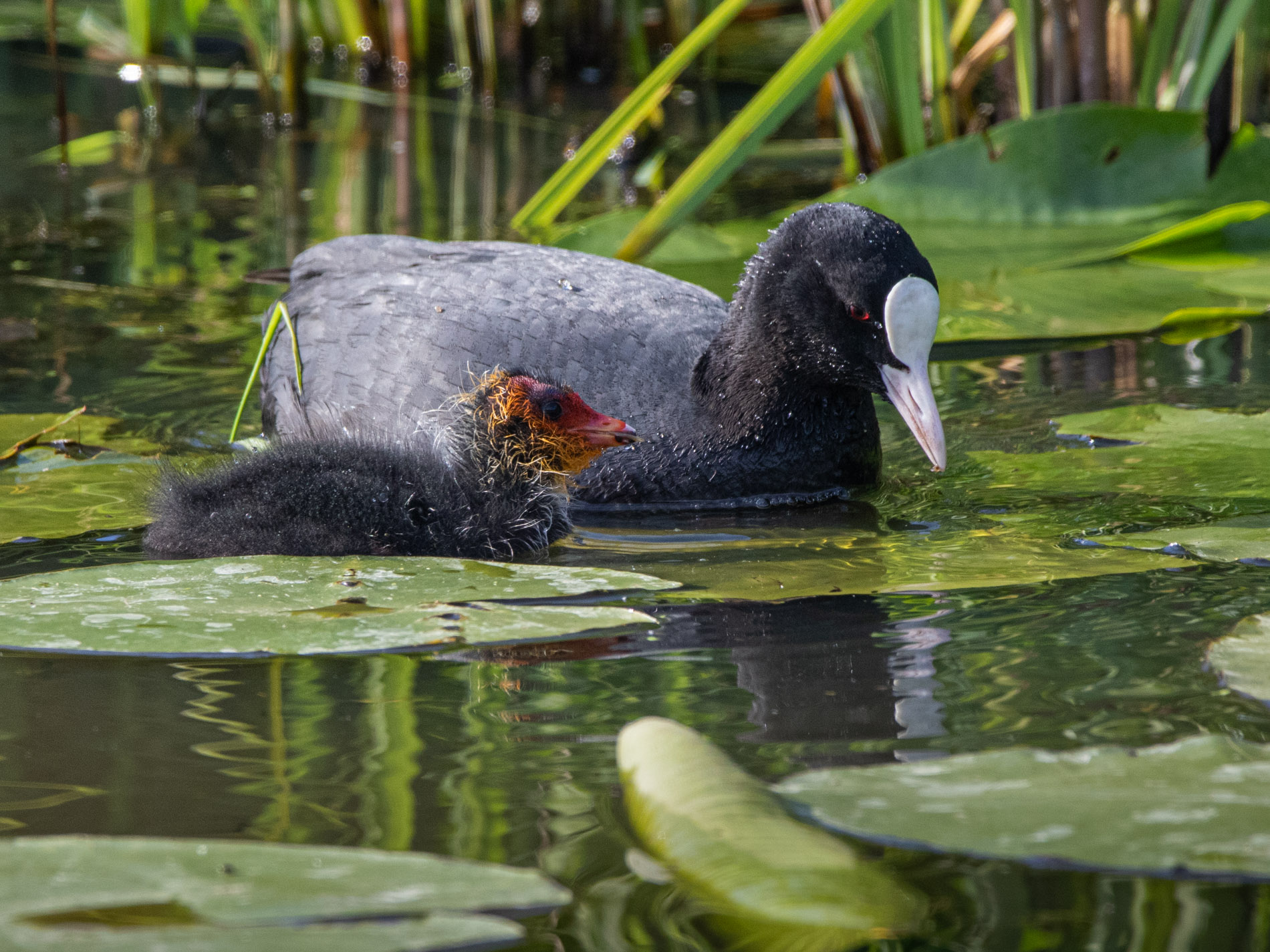 Teichhuhn (Gallinula chloropus) mit noch sehr kleinen Jungen auf einem schmalen Kanal im Bereich des Bruchwalds (nahe des Beoabachtungsturms) [Frühsommer22]; Blässhuhn (Fulica atra) sehr häufig, Nester entlang der Hunte und den Kanälen, oft mit (etwas größeren) Jungen auf den Wiesen
