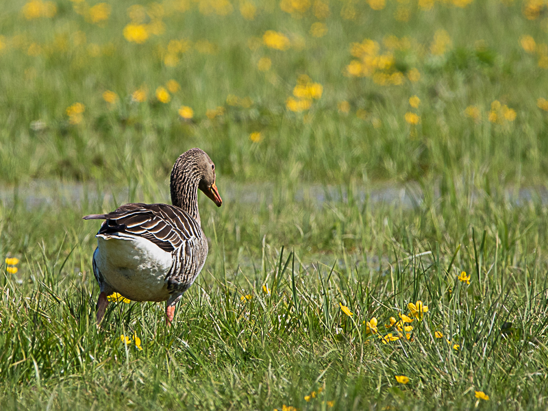 Graugans (Anser Anser) in einer Sumpfdotterblumen-Feuchtwiese