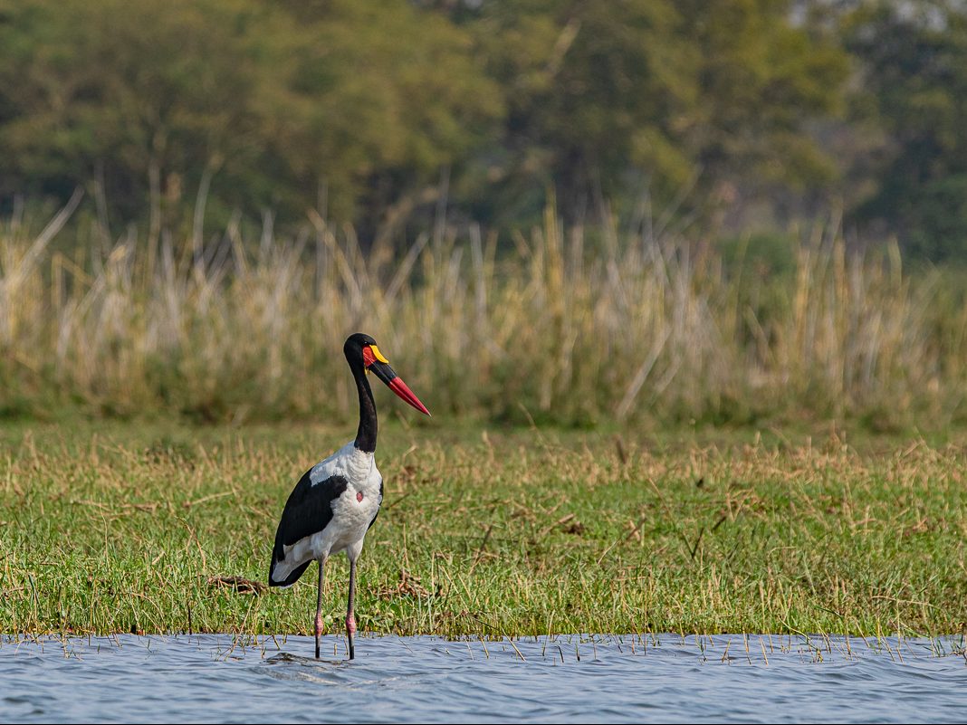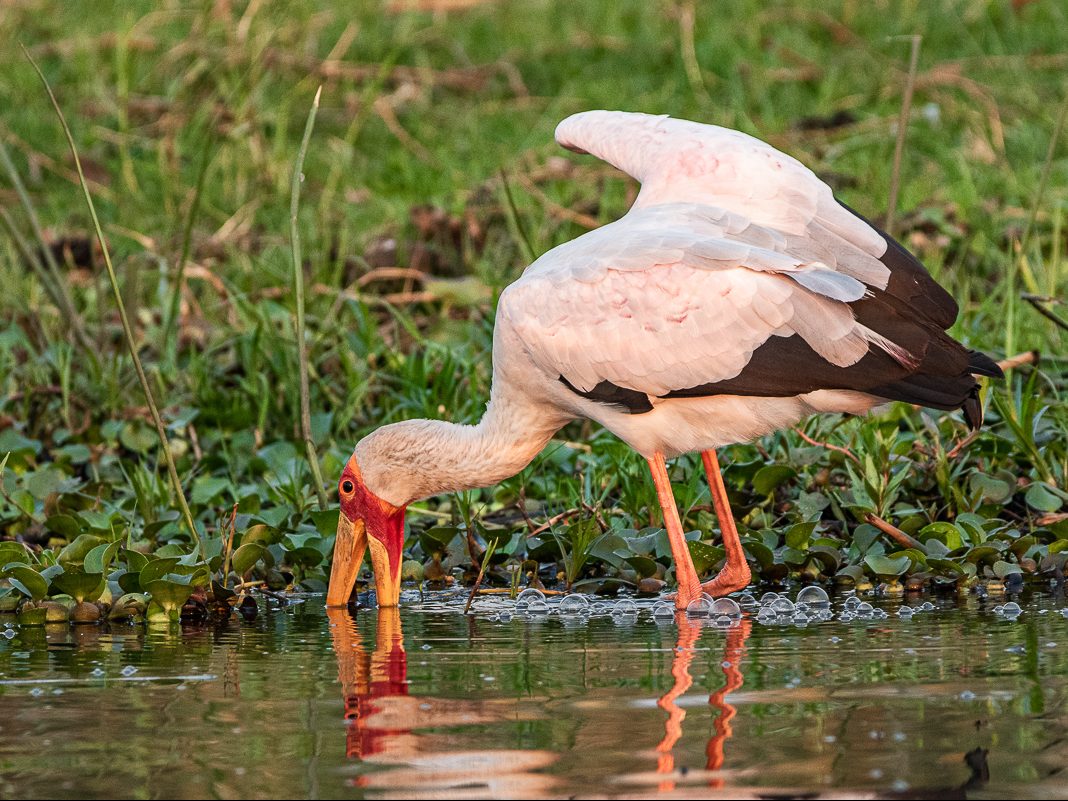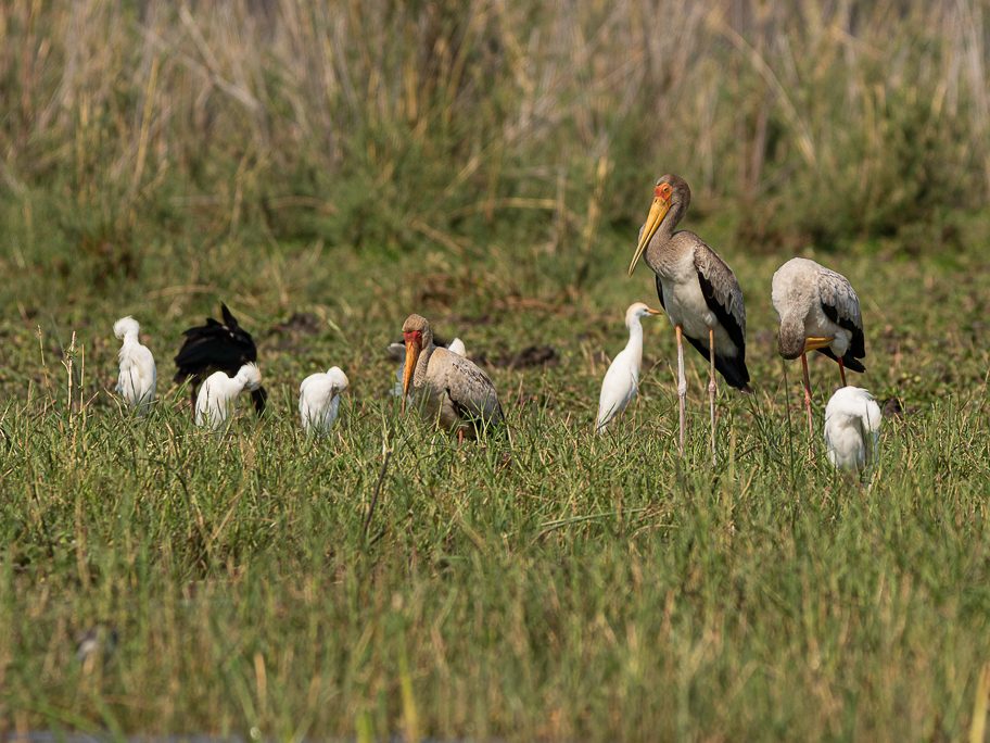 Nimmersatt (Mycteria ibis) – fischt im flachen Wasser, taucht dabei offenen Schnabel ein; Afrikanischer Klaffschnabel (Anastomus lamelligerus) – knackt mit seinem Spezialschnabel Schneckenhäuser; Sattelstorch (Ephippiorhynchus senegalensis) – fischt im flachen Wasser, taucht dabei offenen Schnabel ein, Afrikanischer Löffler (Platalea alba) – nur eine Sichtung im Park, „löffelt“ Kleingetier aus dem Wasser; Heiliger Ibis (Threskiornis aethiopicus) – stochert mit gebogenen Schnabel im Boden, meist nah am Wasser; Hagedasch (Bostrychia hagedash) – stochert mit gebogenen Schnabel im Boden, auch abseits vom Wasser, sitzt gerne etwas erhöht am Ufer, z.B. auf Treibholz oder auf Bäumen, Weißrückenreiher (Calherodius leuconotus) – nachtaktiv, sehr versteckt im Gebüsch oder Bäumen mit über das Wasser hängenden Ästen, oft an Steilufern; Nachtreiher (Nycticorax nycticorax) – dämmerungsaktiv, tagsüber in Gruppen in Bäumen; Rallenreiher (Ardeola ralloides) – verharren oft regungslos in der Ufervegetation und stoßen dann zu; Kuhreiher (Bubulcus ibis) – nicht nur am Wasser, folgen großen Säugetieren; Graureiher (Ardea cinerea) – lauert oft regungslos am Ufer auf Beut, jagt aber auch abseits des Wassers (Kleinsäuger, Insekten); Afrikanischer Silberreiher (Ardea alba melanorhynchos), Afrikamittelreiher (Ardea intermedia brachyrhyncha), Seidenreiher (Egretta garzetta) – drei weiße Reiherarten, häufig am flachen Ufer auf Fischfang; Glockenreiher (Egretta ardesiaca) – schwarzer Reiher mit interessanter Jagdtechnik, oft in kurzer, im Wasser stehender Ufervegetation; Hammerkopf (Scopus umbretta) – jagt im flachen Wasser; Weißbrustkormoran (Phalacrocorax carbo lucidus) – Unterwasserjäger, ruht auf Bäumen, Treibholz und Termitenbauten, trocknet Gefieder mit ausgebreiteten Flügeln; Afrika-Schlangenhalsvogel (Anhinga rufa) – Unterwasserjäger, spießt Beute auf, schlangenartiger Hals, ruht auf Bäumen, Treibholz und Termitenbauten, trocknet Gefieder mit ausgebreiteten Flügeln