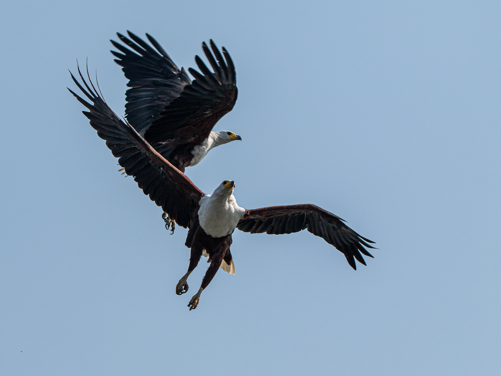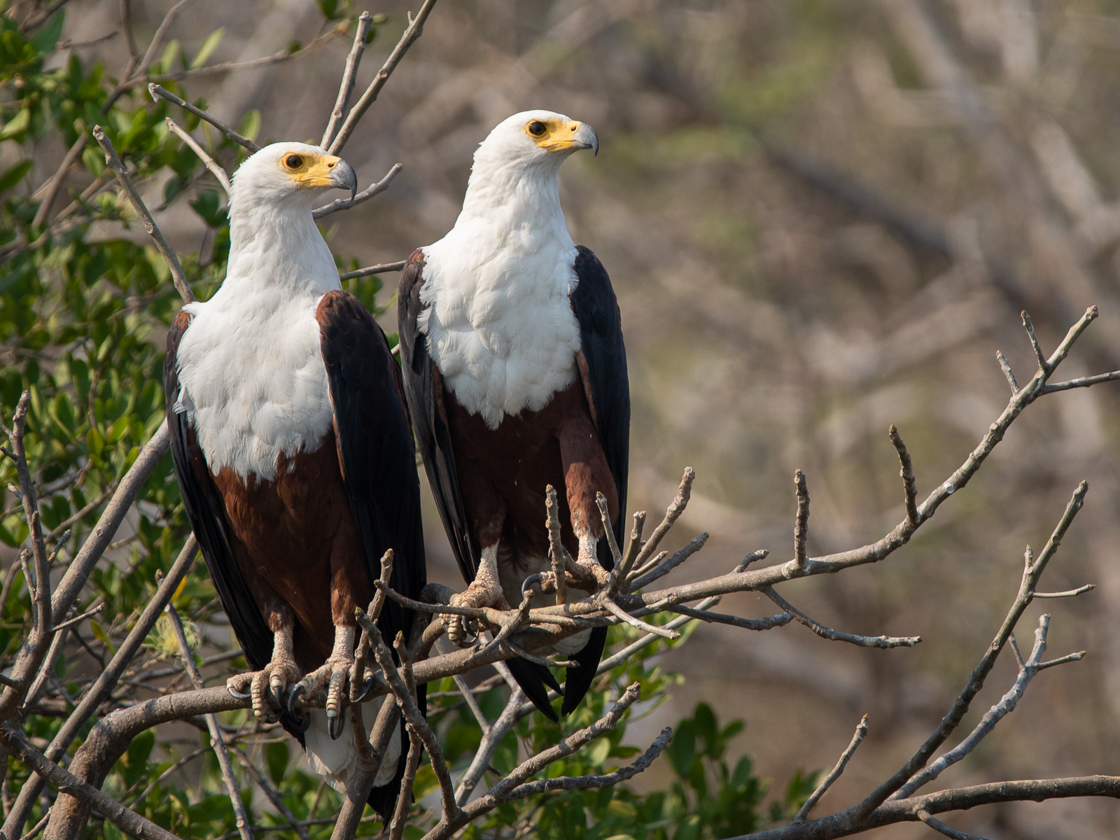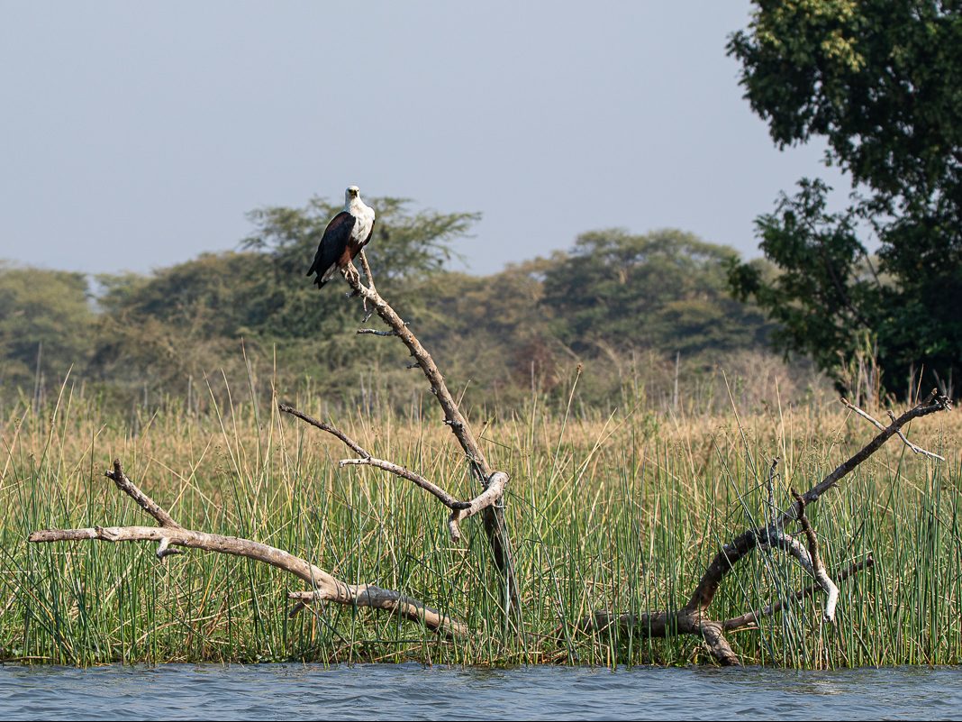 Afrikanische Schreiseeadler (Haliaeetus vocifer) – am Fluss allgegenwärtig, gesellig, in Bäumen ruhend, jagt Fische auf der offenen Wasserfläche; ruft häufig; weitere Greife in der Vogeliste beschrieben, nicht unbedingt ans Wasser gebunden, einige aber ggf. auch am Fluss zu beobachten (z.B. überfliegend)