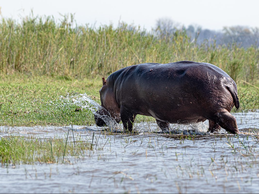 Flusspferde (Hippopotamus amphibius) – im Wasser und auf den Grasflächen am Ufer