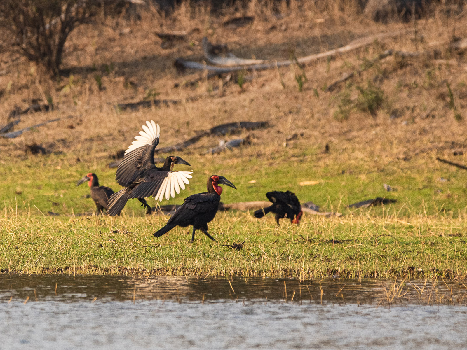 „Südlicher Hornrabe“ (Bucorvus leadbeateri) – eigentlich ein Vogel der Trockenbiotope, aber auch auf den Grasflächen am Ufer des Shire zu sehen; ggf. auch weitere Hornvogelarten ab und an in Flussnähe zu beobachten (z.B. wenn Bäume nahe am Ufer stehen)