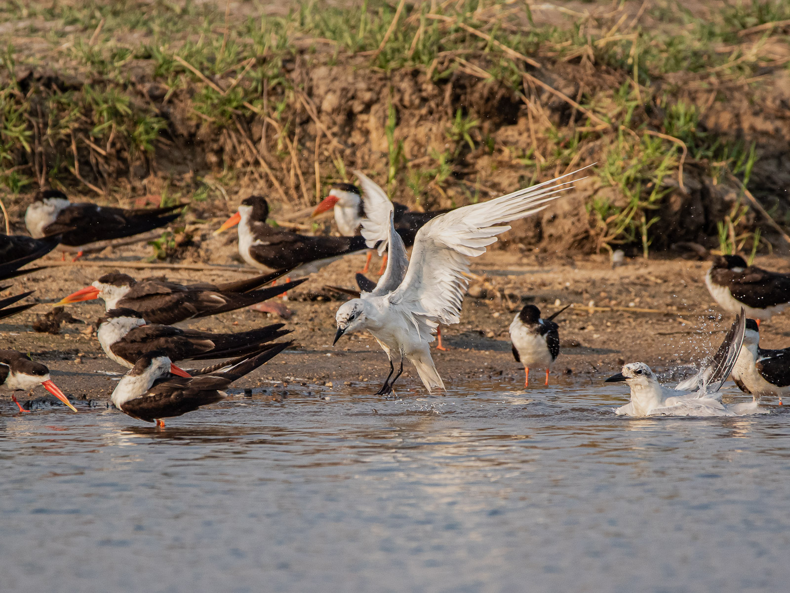 Scherenschnäbel (Rynchops flavirostris) – rasten in großen Truppes am flachen Ufer mit wenig Vegetation, oft auf und landen wieder, jagen fliegend im offenen Wasser, in dem sie dabei den geöffneten Schnabel durch das Wasser „ziehen“; Graukopfmöwe (Chroicocephalus cirrocephalus), Lachseeschwalbe (Gelochelidon nilotica), Weißflügelseeschwalbe (Chlidonias leucopterus) – alle drei oft zwischen den Scherenschnäbeln