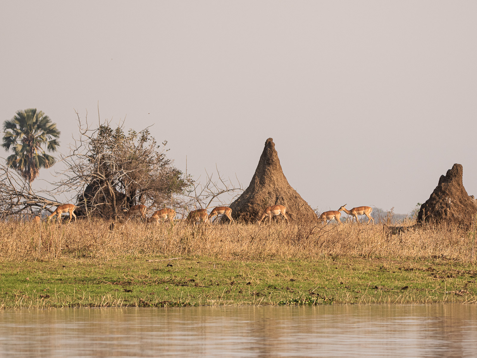 Impalas (Aepyceros melampus) – regelmäßig am Ufer des Shire zu sehen, oft dort, wo die Termitensavanne an den Fluss grenzt
