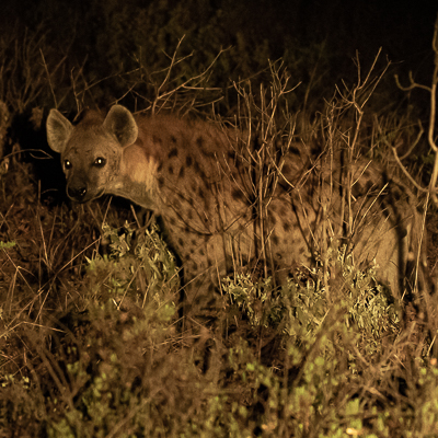 Tüpfelhyänen (Crocuta crocuta) [engl. spotted hyena] sind in Subsahara-Afrika weit verbreitet. Sie sind hinsichtlich ihres Lebensraum wenig wählerisch, meiden nur Wüsten und Regenwälder. Die Tiere sind meist in der Dämmerung und nachts aktiv. Sie leben in Rudeln und fressen viel Aas, jagen aber auch selbst. Weil sie viel Knochen verspeisen (extrem kräftiges Gebiss!) ist ihr Kot auffällig weiß! Wir hatten eine Sichtung im Liwonde National Park während einer Nachtexkursion.