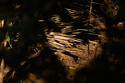 Das Südafrikanische Stachelschwein (Hystrix africaeaustralis) [engl. Cape porcupine] ist mit 60 bis 80 cm Kopf-Rumpf-Länge das größte Nagetier Afrikas. Es stellt kaum spezielle Ansprüche an seinen Lebensraum und ist demenstprechend sehr weit verbreitet, auch im Kulturland. Stachelschweine leben am Boden. Sie sind nachtaktiv. Den Tag verbringen sie in meist selbst gegrabenen Bauten. Wegen ihrer heimlichen Lebensweise bekommt man sie nur selten zu Gesicht. Wir hatten eine Sichtung während einer Nachtsafari im Liwonde National Park und es gelang ein Belegfoto im Scheinwerferlicht, auf dem man die bis zu 50 cm langen Stacheln erkennen kann.