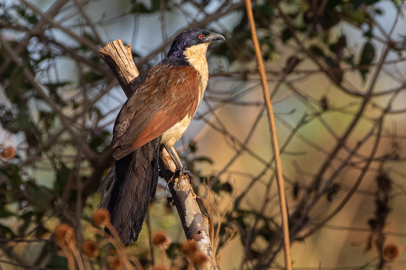 Den Kupferschwanzkuckuck (Centropus cupreicaudus) [engl. Coppery-tailed Coucal] (46-52 cm; groß!) entdeckten wir irgendwo unterwegs im Großraum Lilongwe (Karte) (kurzer Fotostopp während einer Autofahrt). Die Vögel sind stark an Gewässer gebunden und halten sich dort vornehmlich im „Gebüsch“ auf. Sie ähneln dem bekannteren, etwas kleineren Spornkuckuck (Centropus senegalensis) [Senegal Coucal] (38-49 cm), haben aber einen bronze schimmernden Schwanz. Auch ist die dunkle Kopf-Nacken-Kappe etwas ausgedehnter. (Keine Spornkuckuck-Beobachtung auf dieser Reise).