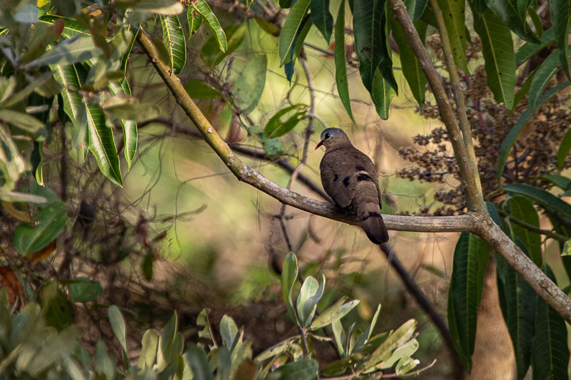 Die kleine (20-22 cm) Stahlflecktaube (Turtur afer) [engl. Blue-spotted Wood-dove] bewohnt nicht allzu dichte, feuchte Waldbiotope und kommt als Kulturfolger in die menschliche Nähe. Die Art ist nicht selten, wird aber wegen ihrer etwas versteckten Lebensweise oft übersehen. Typisch sind die stahl-blauen, glänzenden Flecken auf den Flügeln und der rote Schnabel mit der gelben Spitze. – Unsere Sichtungen: am Malawisee (Chinteche; Karte)
