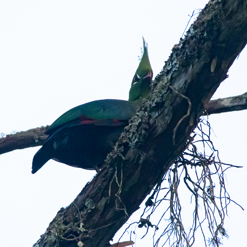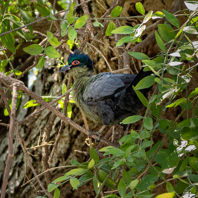 Den Glanzhaubenturako (Tauraco porphyreolophus) [engl. Purple-crested Turaco] (42-46 cm) konnten wir im Liwonde National Park beobachten; Unterart Tauraco Gallirex porphyreolophus chlorochlamys