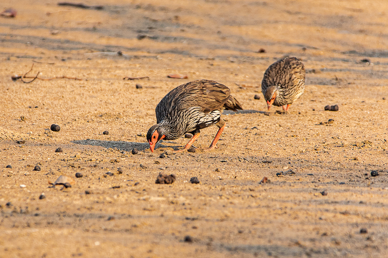 Rotkehlfrankoline (Pternistis afer loangwae) [engl. Red-necked Francolin] (30 bis 40 cm). Die Art spaltet sich in zahlreiche Unterarten, im Liwonde National Park (unsere Beobachtung) ist es wohl loangwae, aber die Systematik ist nicht abschließend geklärt. Typisch für alle ist die nackte, rote Haut im Gesicht und an der Kehle.