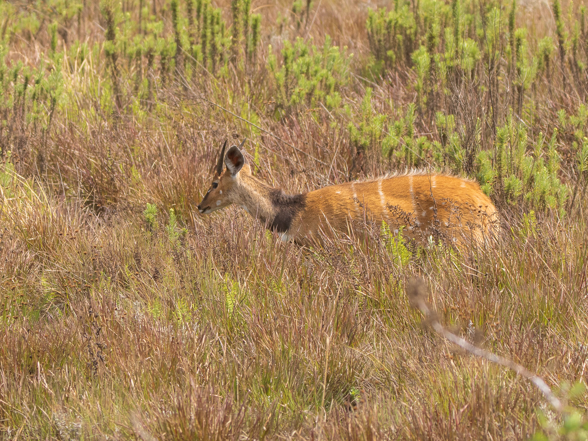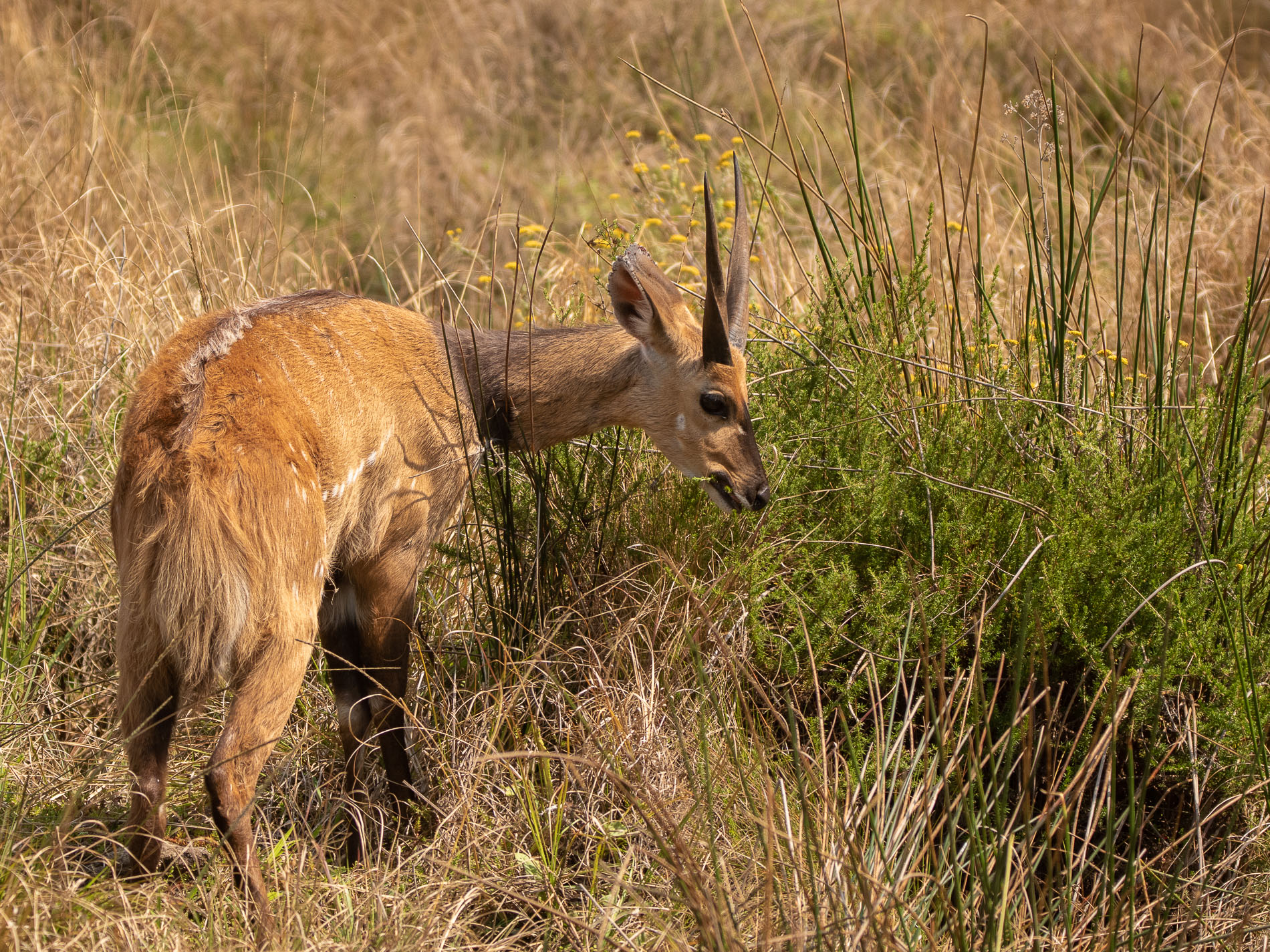 Wie ihr Name schon sagt, bevorzugen Buschböcke (Gattung Redunca) (etwa wie ein kräftiges Reh) Habitate mit Gebüsch, das ihnen Deckung bietet. Da Buschwerk auf dem Nyika-Plateau aber eher selten ist, sieht man die Tiere auch regelmäßig in der offenen Landschaft. Allerdings bevorzugen sie Bereiche mit höherer Vegetation. Buschböcke sind meist einzeln unterwegs.