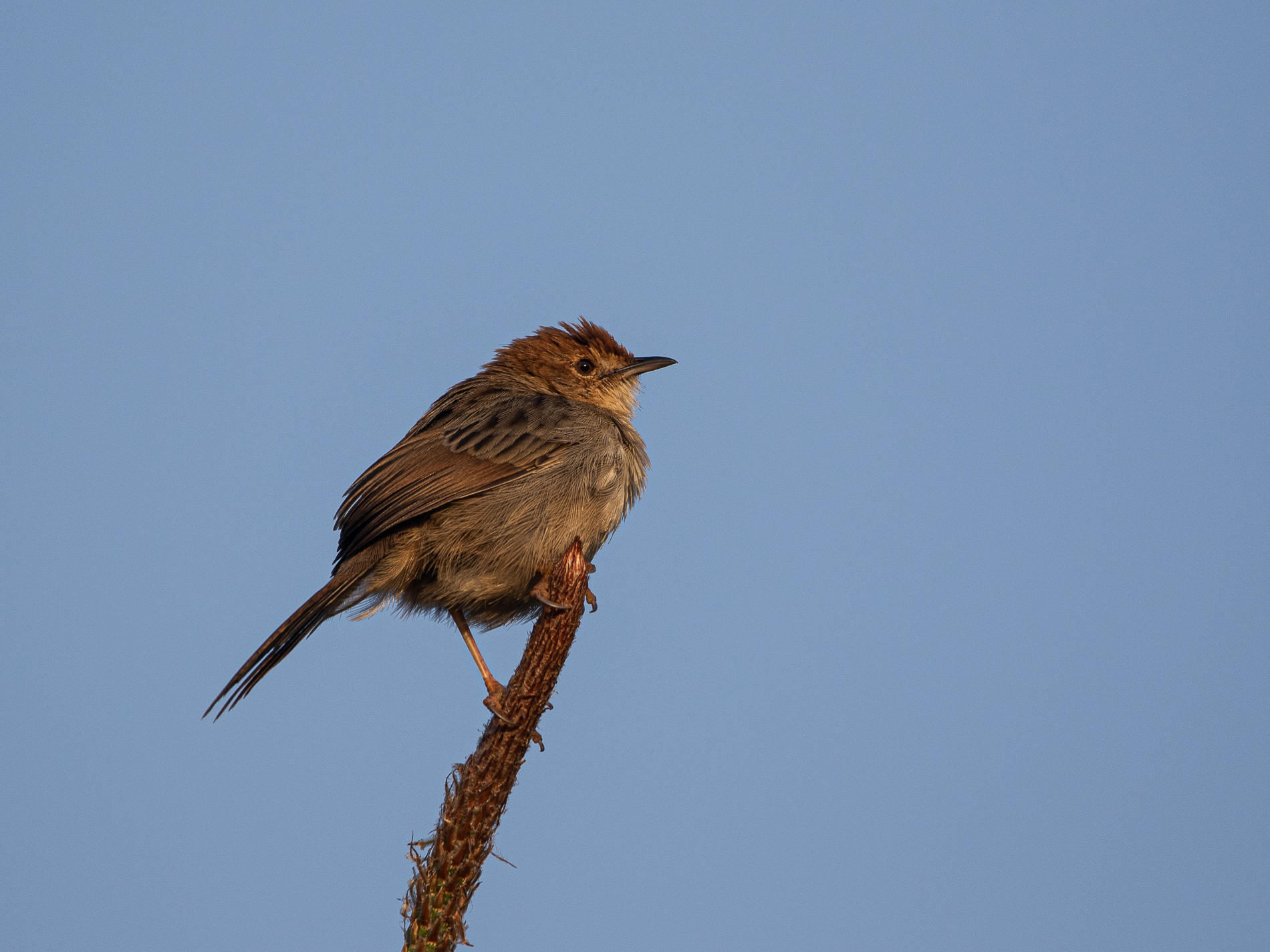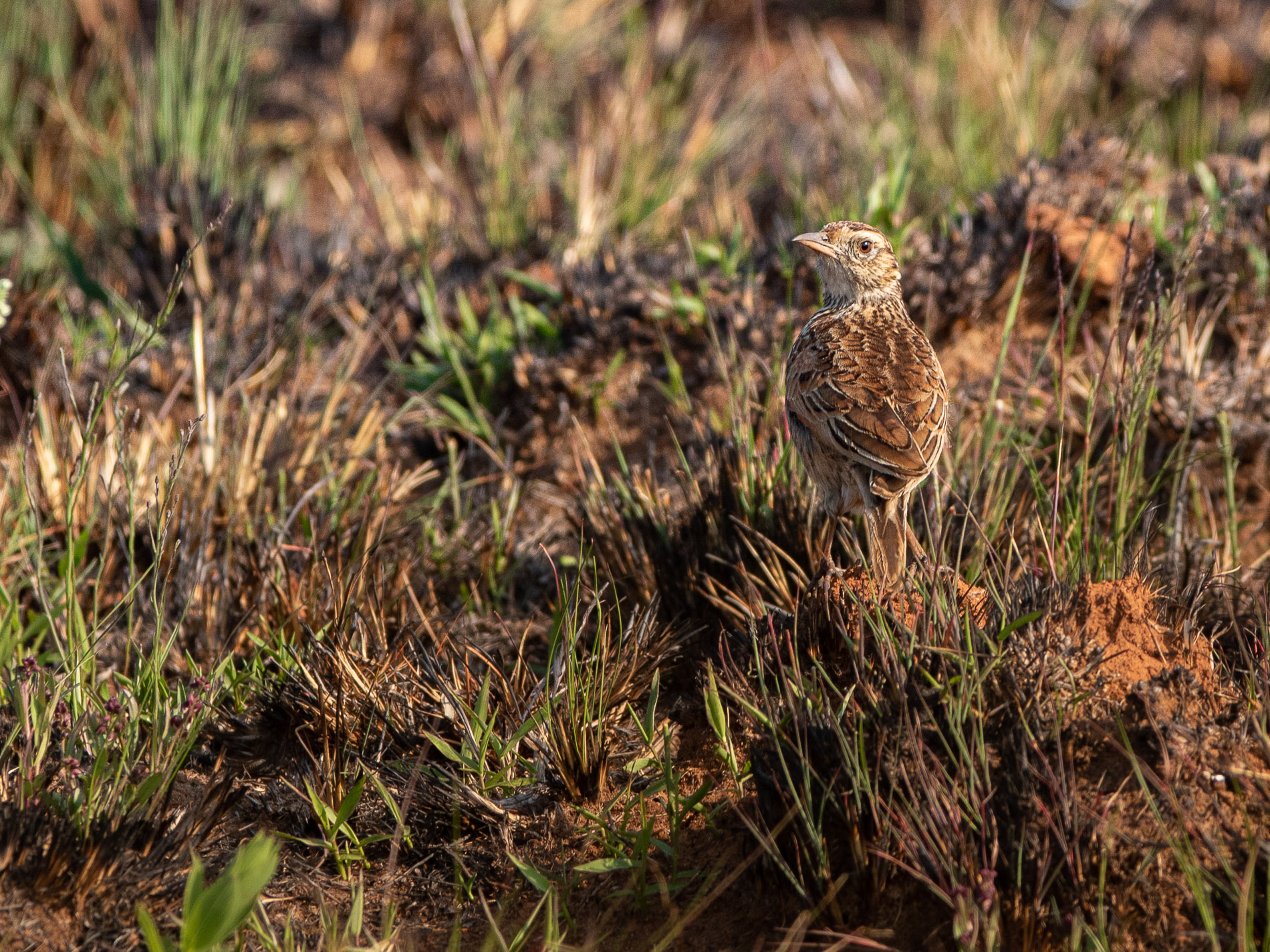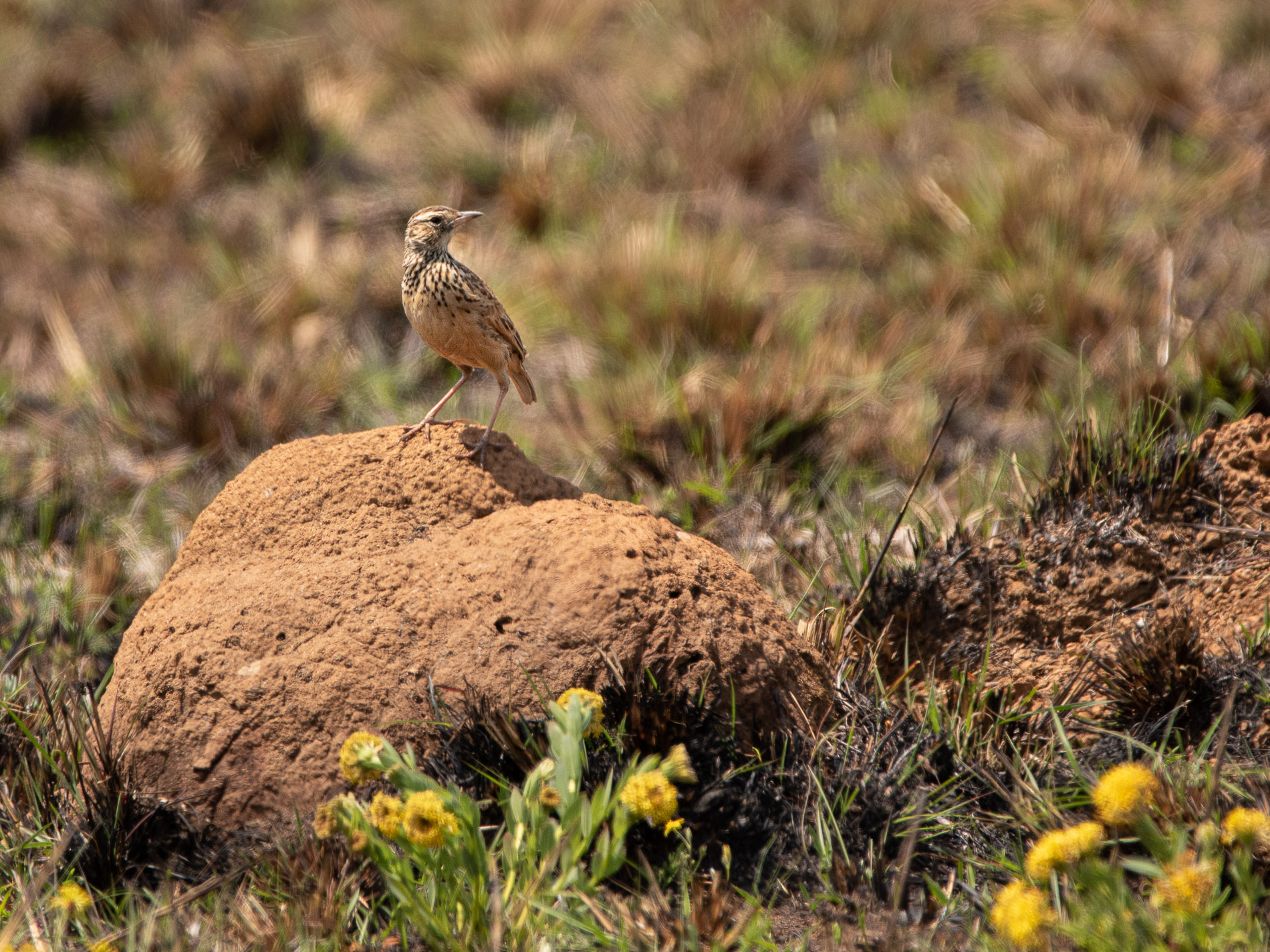 Ebenso gut getarnt ist der Zimtspornpieper (Anthus cinnamomeus) (VL7). Es ist der „Allerweltsvogel“ des Graslands und im Nyika National Park recht häufig. Man sieht ihn recht häufig auf erhöhten Ausgucken (Termitenhügel, Felsen). Er bevorzugt Gebiete mit kurzem Gras, gerne auch die kürzlich abgebrannten Flächen.