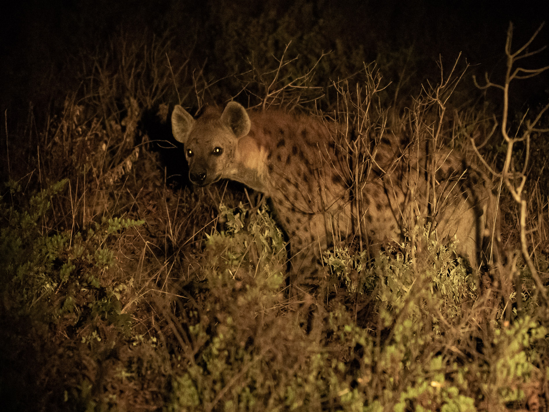 Große Raubtiere sieht man selten auf den Safaris, wir konnten während einer Nachtexkursion eine Tüpfelhyäne und einen Streifenschakal sichten. Auch ein Buschhase tauchte im Schein der Lampen auf.