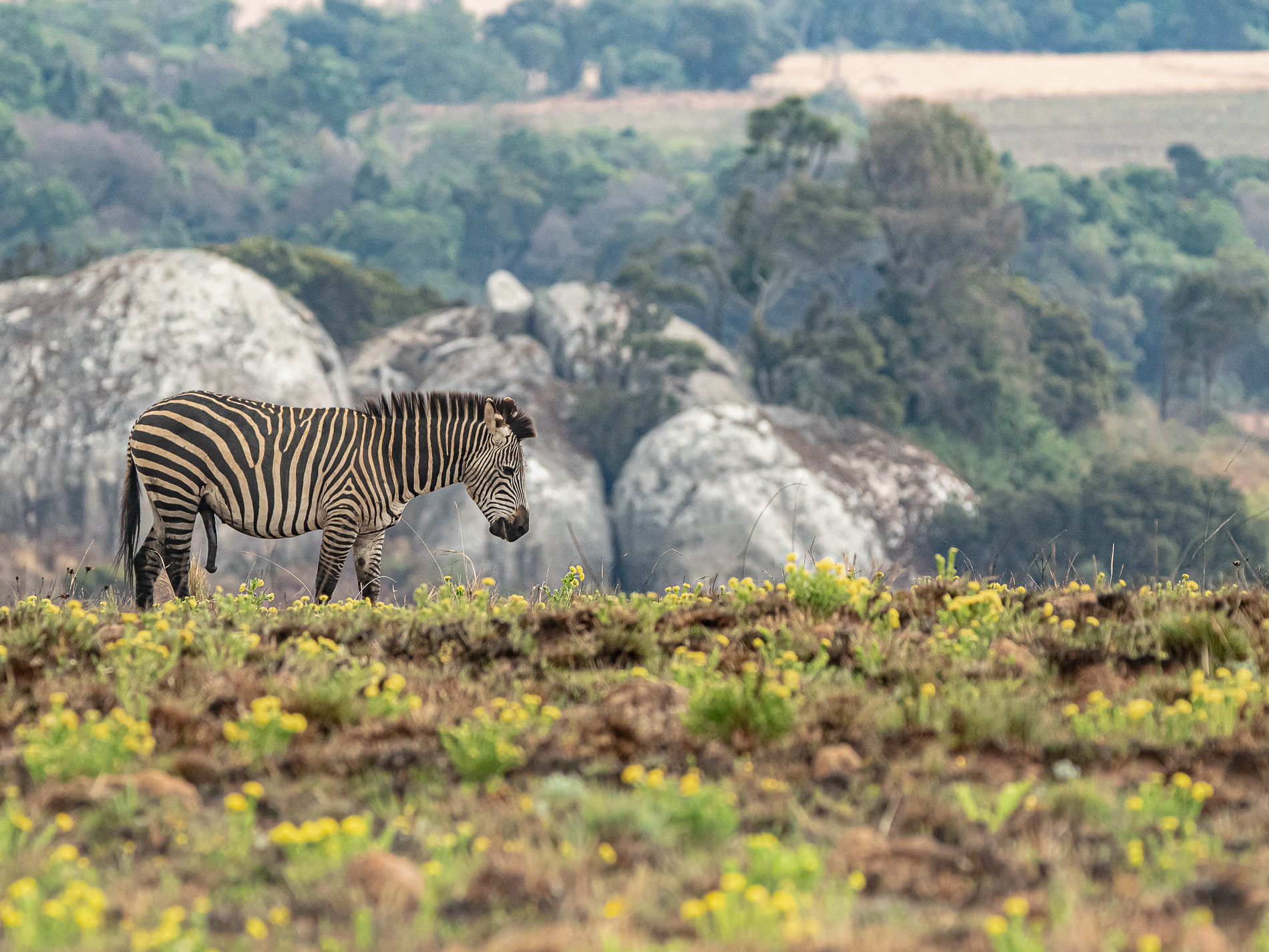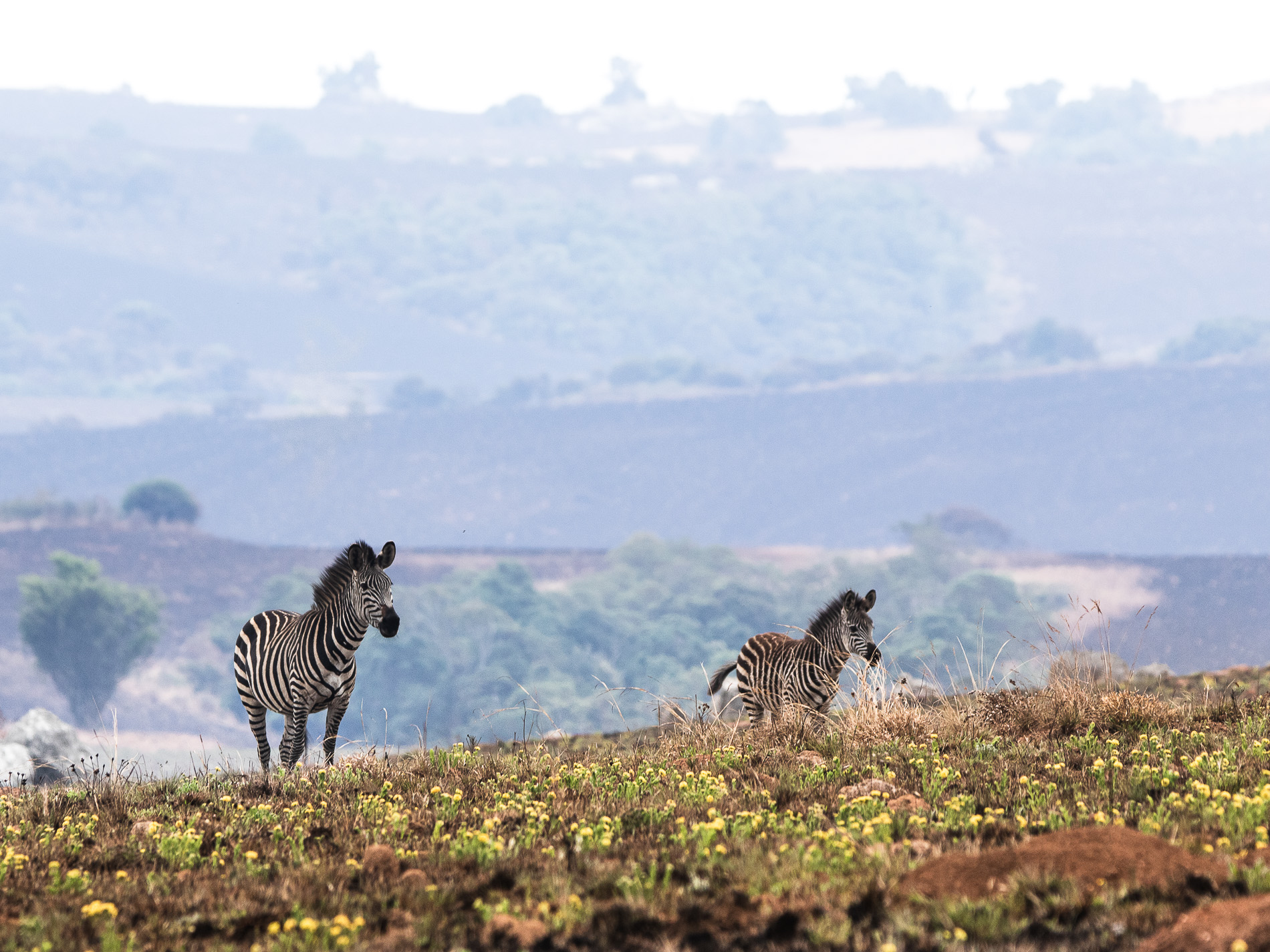 Zebras (Crawshay-Zebra – Equus quagga crawshayi) haben wir meist in der Umgebung von großen, kahlen Felsformationen gesehen, aber das könnte auch Zufall gewesen sein, weil vielleicht gerade dort das Nahrungsangebot am reichhaltigsten war. Die Tiere streifen in kleinen Gruppen über das Plateau.