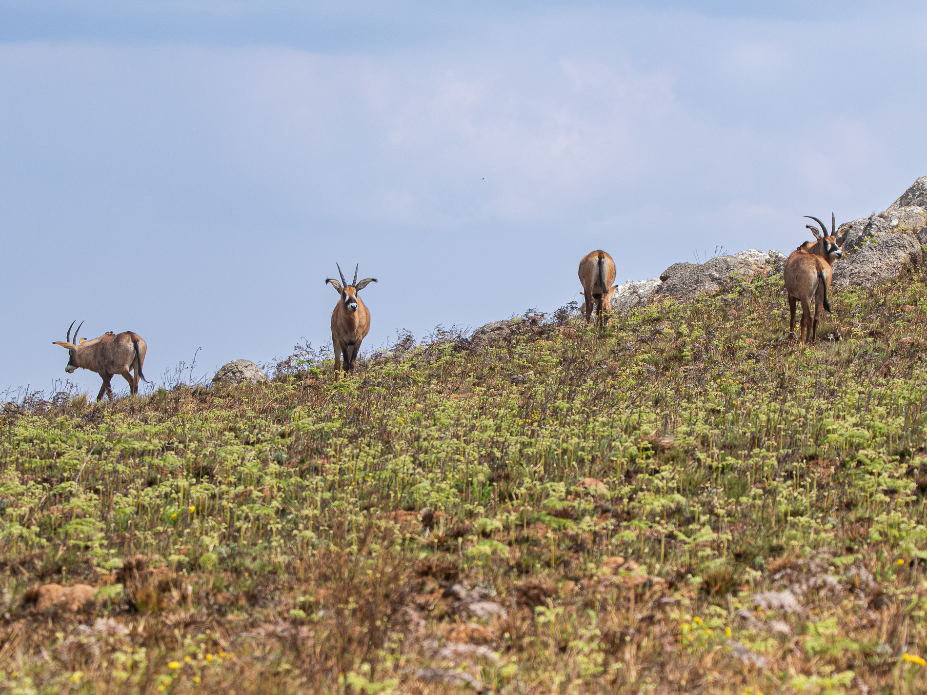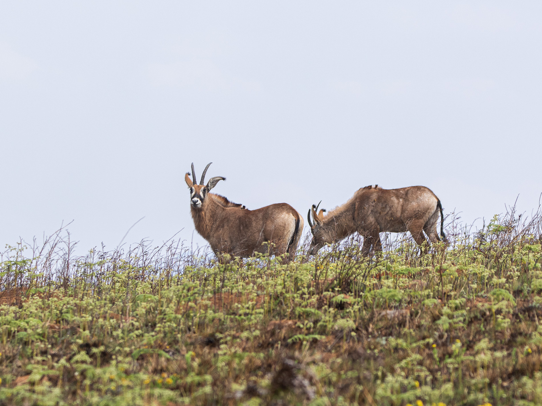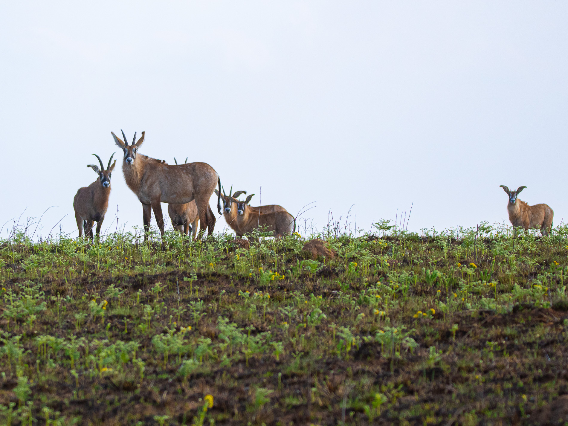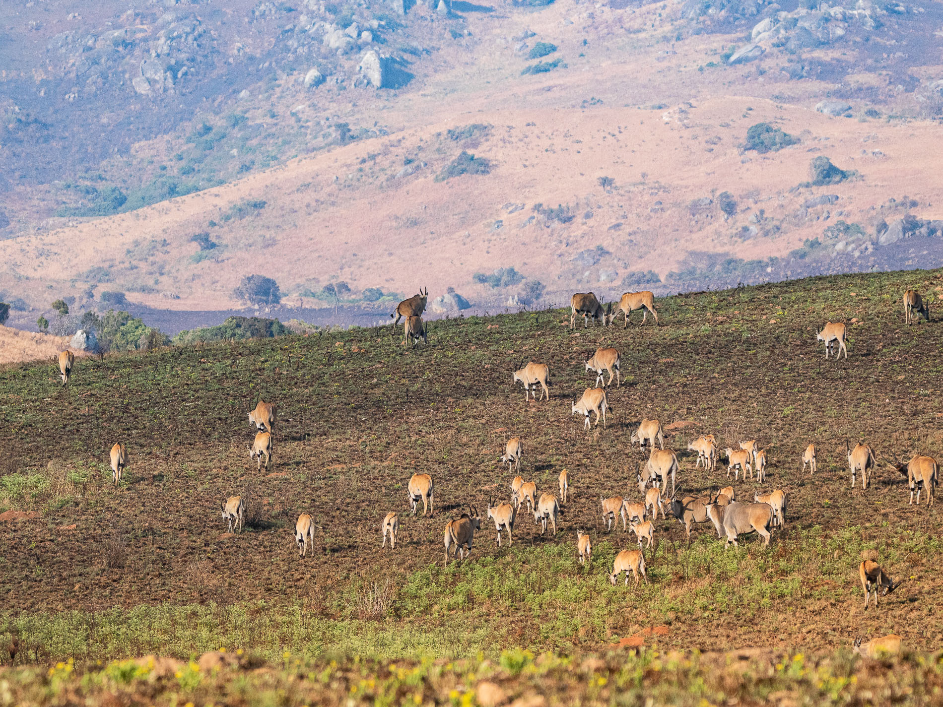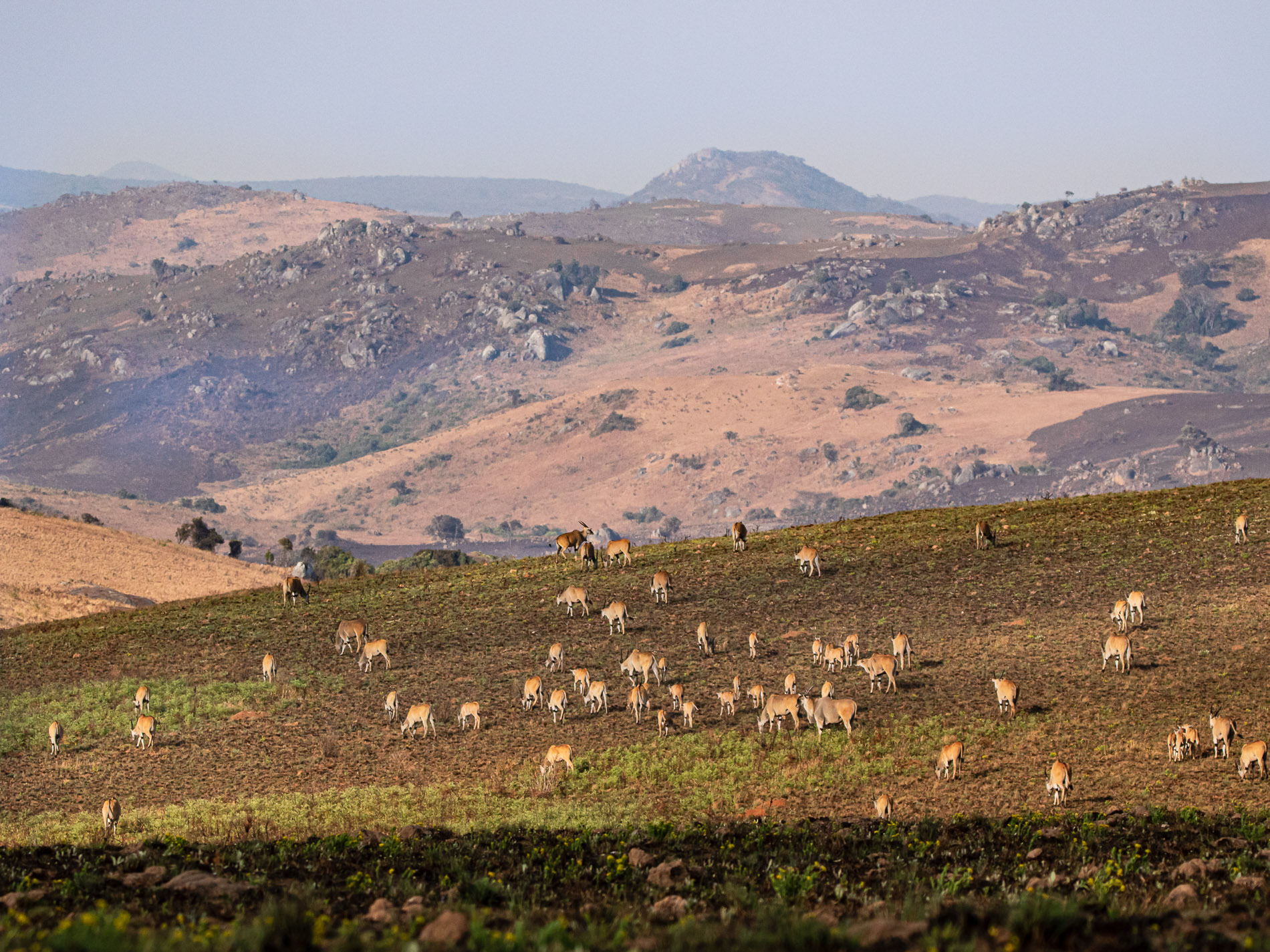 In der den afromontanen Grasländern gibt es nicht so ein immense Ansammlung von Tieren wie in den Savannen des Tieflands, aber die etwa wie ein schlankes Rind großen Elenantilopen (Taurotragus oryx)  ziehen in Gruppen von einigen hundert Tieren über das Nyika-Plateau. Meist sind die Tiere gemächlichen Schrittes unterwegs und suchen vorwiegend dort ihre Nahrung, wo auf abgebrannten Flächen der Pflanzenwuchs sich wieder entwickelt. Man findet sie weniger auf reinen Grasflächen, denn eigentlich sind diese Antilopen eher Laubfresser.