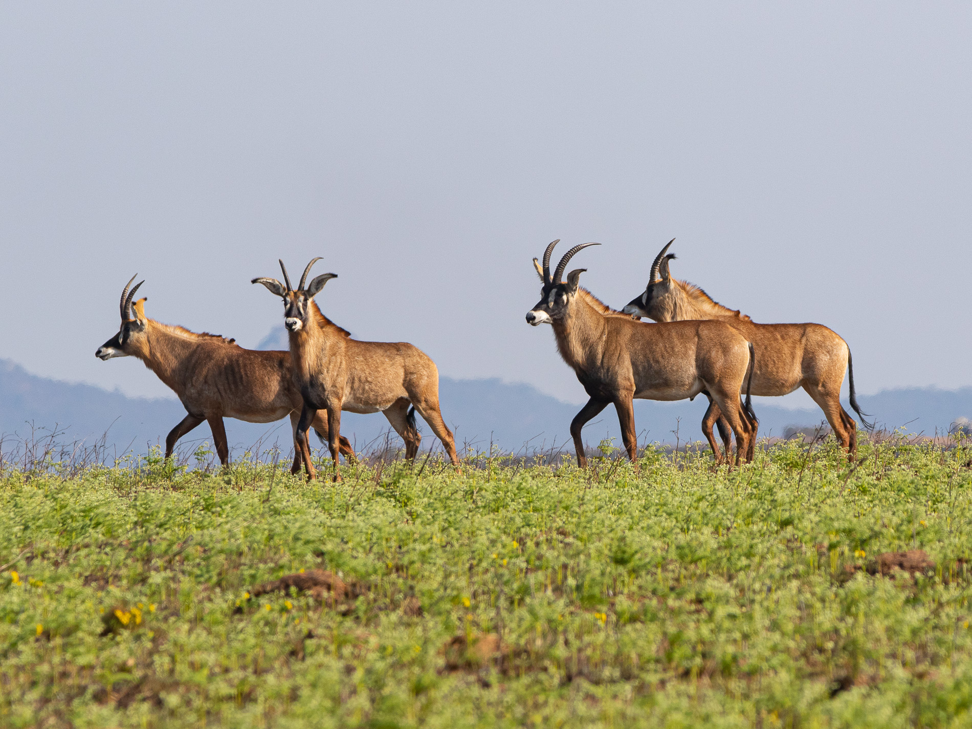 Die ebenfalls großen Pferdeantilopen (Hippotragus equinus) (etwa wie ein kleines Pferd) halten sich gerne in Bereichen mit etwas Bewaldung auf und bevorzugen die Nähe von Wasserstellen. Meist treten sie in Trupps von etwa 20 – 30 Tieren auf. Man erkennt sie recht leicht an den schwarz-weißen Gesichtern und den innen ebenfalls weißen Ohren.